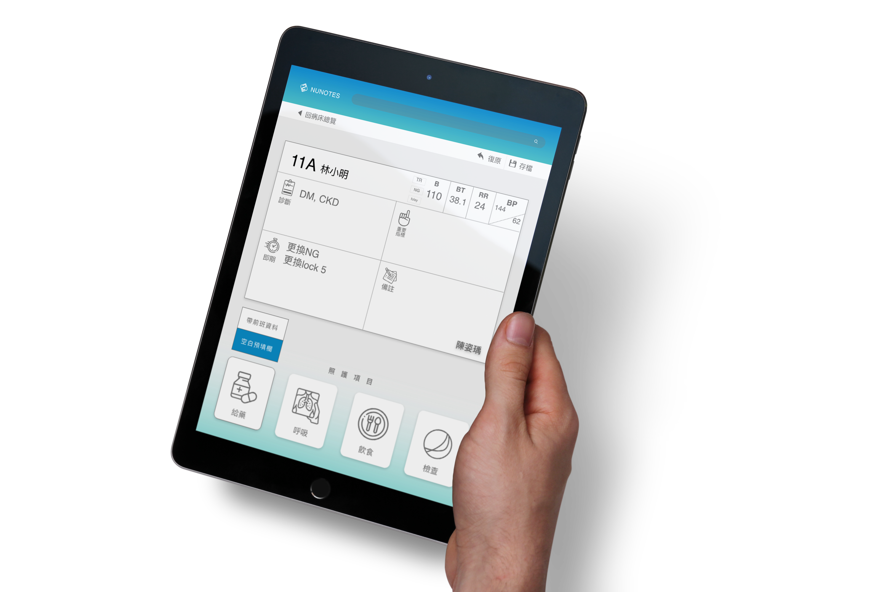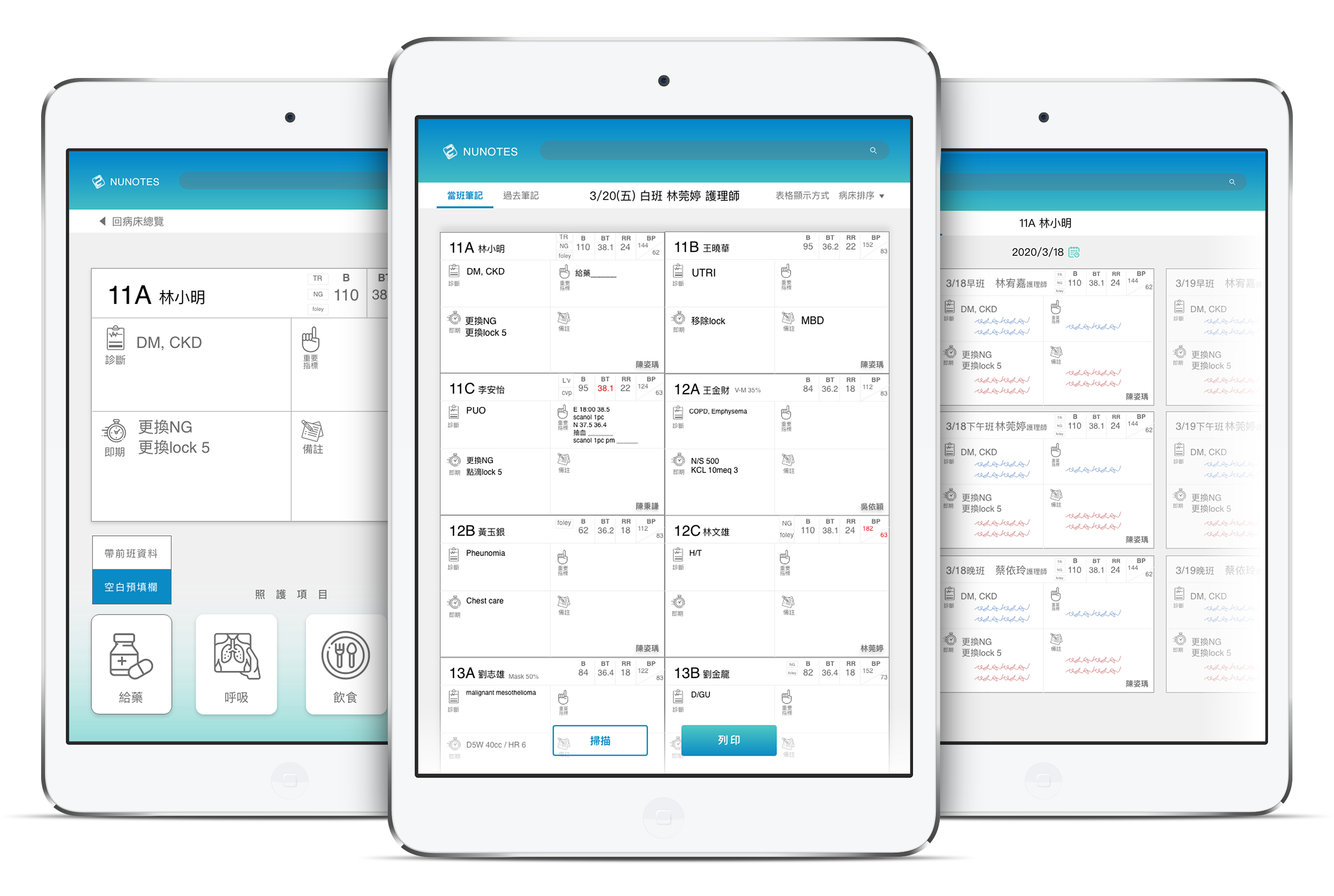 其參考護理師原先的手寫筆記規劃UI,設計「自動帶入必要資訊」、「自訂手寫筆記重點」、「一鍵掃描,查找共享」之重點功能。