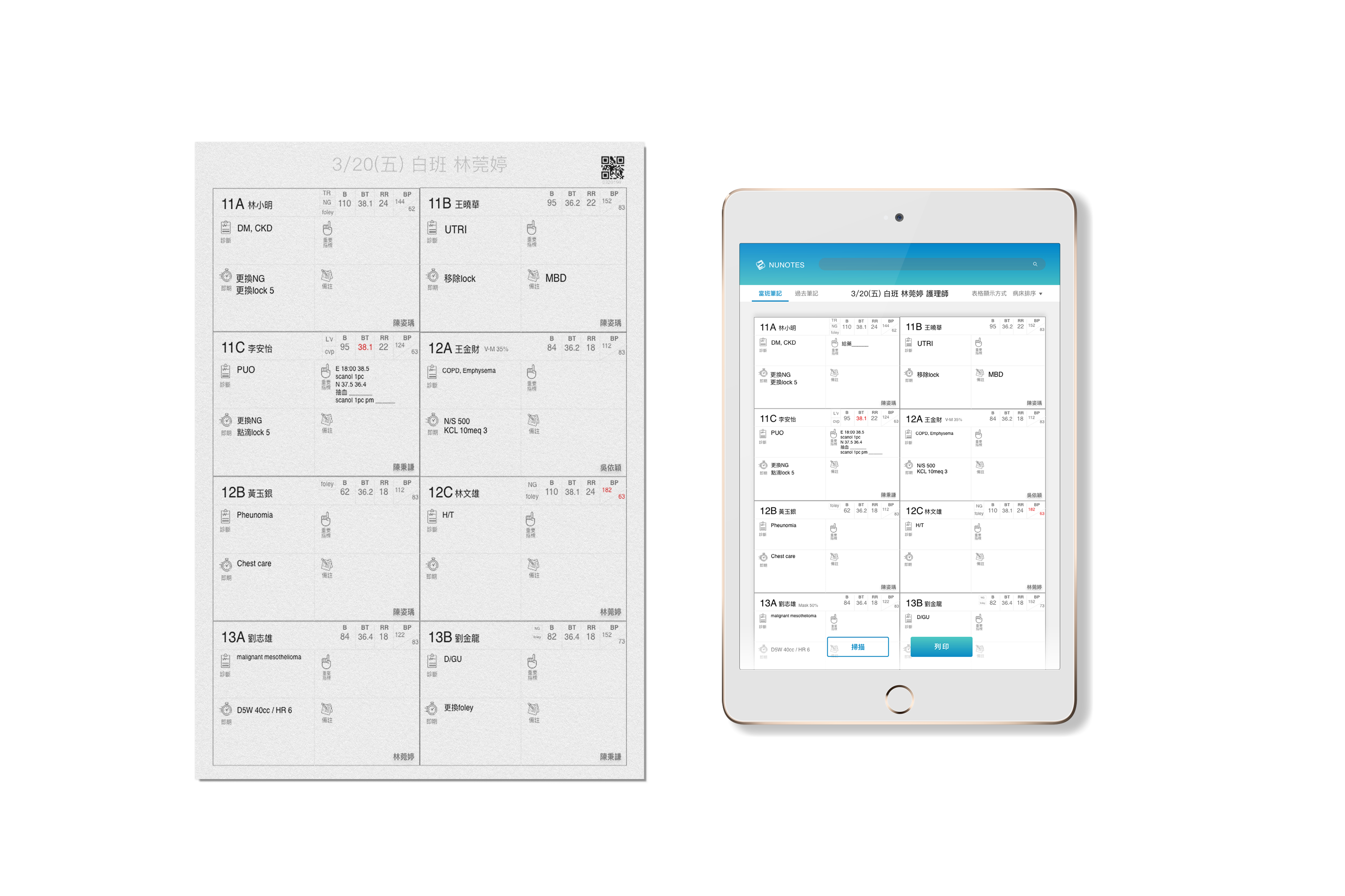 交班前一鍵掃描筆記紙,快速上傳系統。交班時可迅速查找筆記及相關系統的數值並和單位同仁共享筆記。